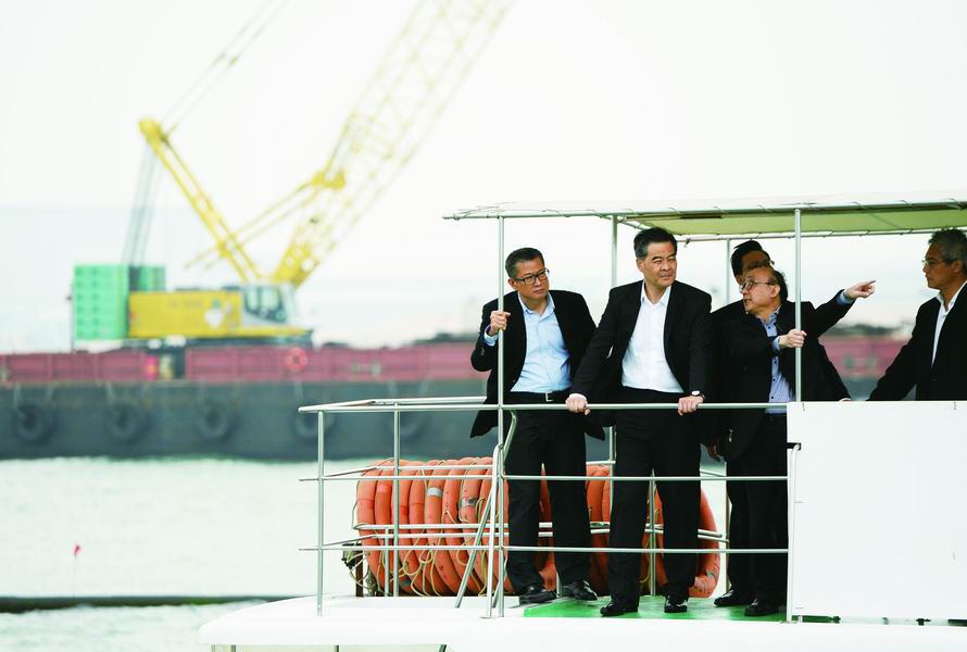 4月4日,香港特区行政长官梁振英(左二)在大屿山视察港珠澳大桥香港口岸人工岛工程工地。