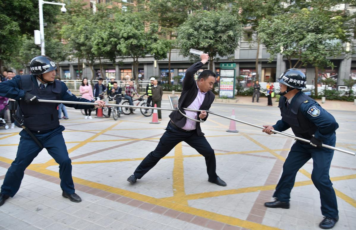 南方大视野2016年12月19日讯(记者 罗珍 特约通讯员 陈琼珊、蒋小平 深圳报道)“下午放学时段,一名陌生男子持凶器欲闯入校园,值班保安立即上前拦截,并按动一键报警,护校队的老师们听到警报后迅速携带警棍与暴恐分子展开周旋……”这是横岗中学12月16日下午开展的防暴应急演练一幕。