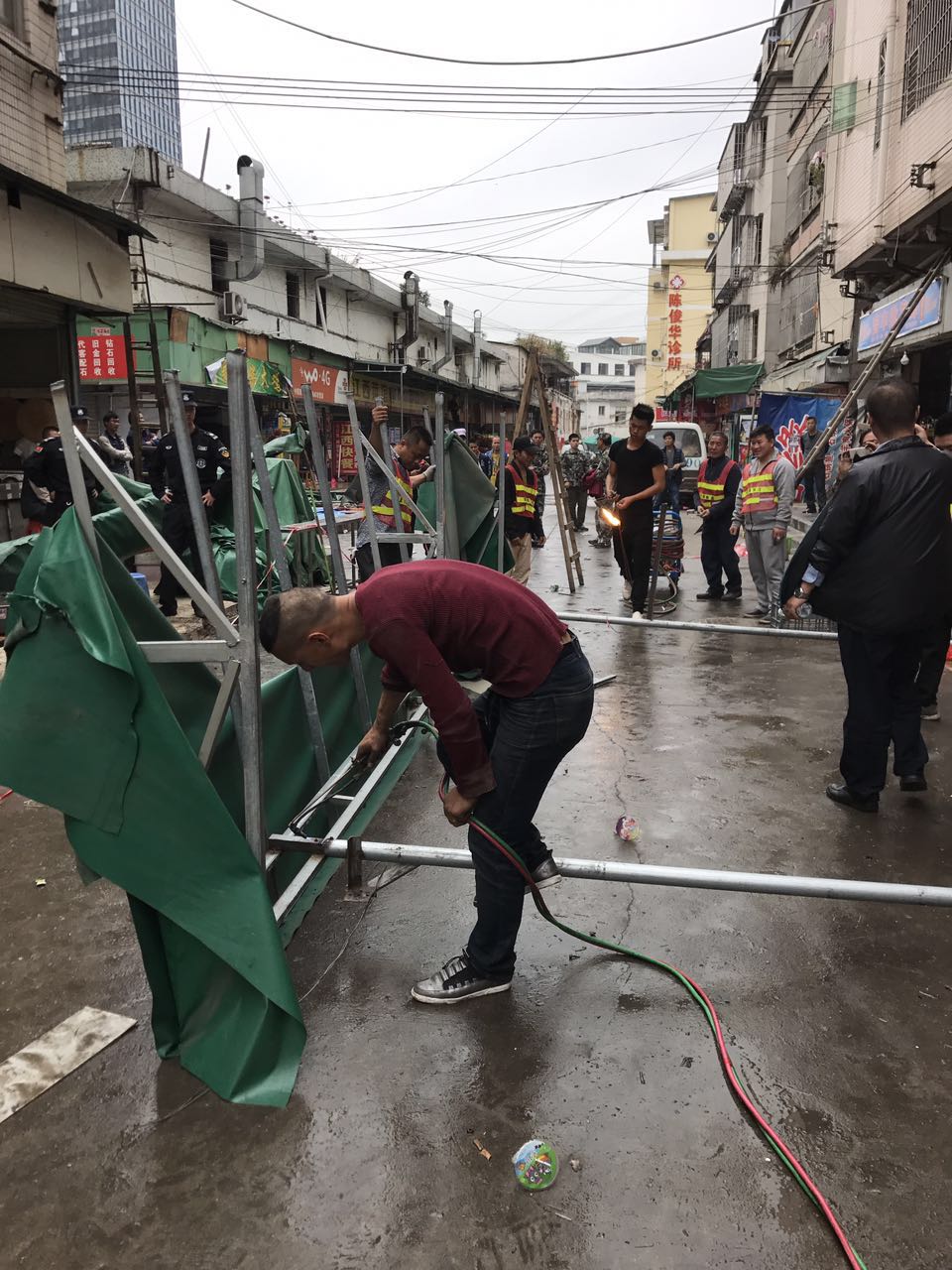 华龙新村、上水径市场两条街部分一楼住户为了增加使用面积,在门前搭建一些钢架结构临时建筑。由于近几年查违管控非常严格,现存的乱搭建都是几年前的构筑物,框架锈蚀严重,存在严重安全隐患。为落实街道“城市质量提升年”的部署要求,全力消除安全隐患,吉华街道执法队联合光华社区、水径社区工作站对此两条街上的50余宗乱搭建进行了集中拆除。