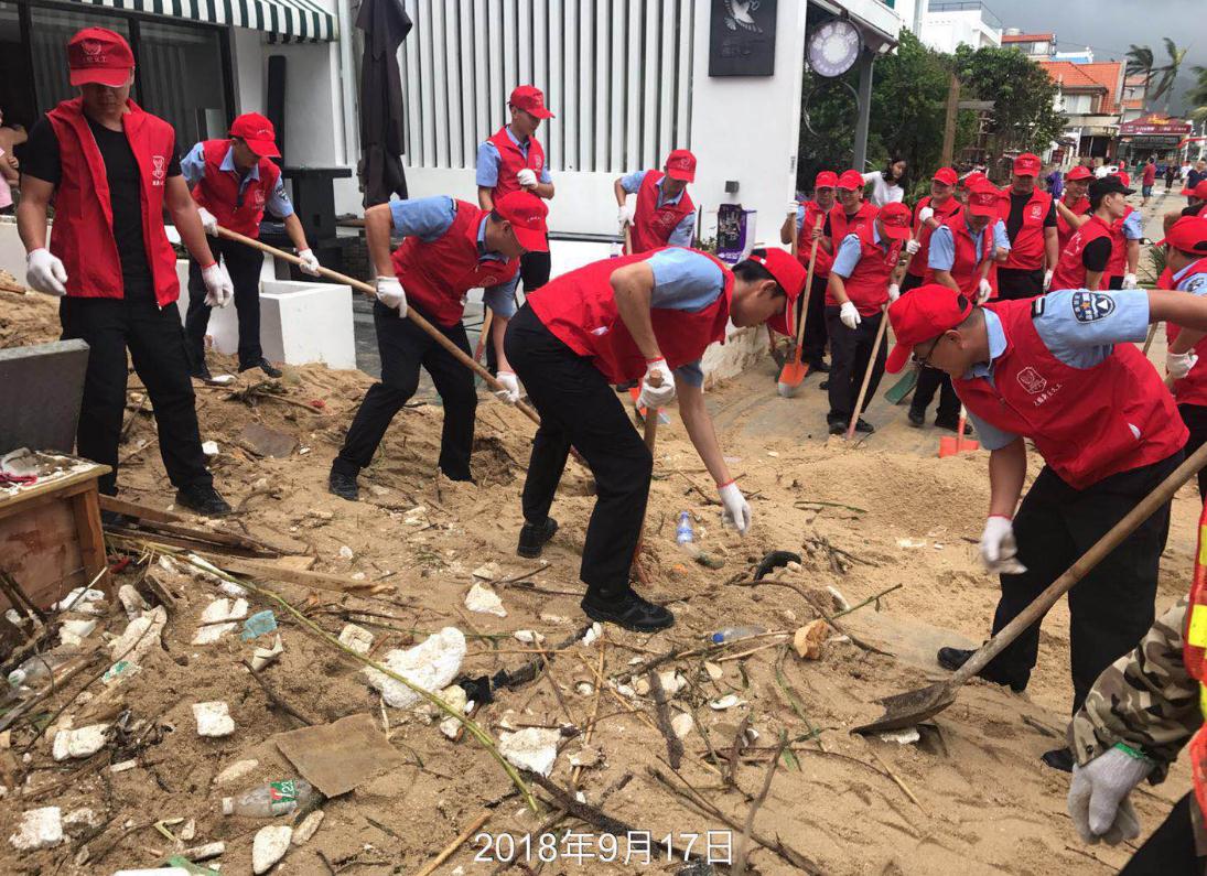 9月16日,台风来袭,全体人员在岗在位,通宵达旦值班值守。大风大雨中,工作人员逆风而动,逆水而行,灾情就是命令,群众就是一切。森林消防中队队员主动深入防抗台风一线岗位,亲身深入抢险抗灾一线,动手清理阻塞在主干道上倒伏的树木及障碍物,有效确保道路畅通及交通安全。涉水前行,疏通下水管道,解救围困群众,用充气艇或者车辆运送群众,用自己厚实的肩膀将老人从家中背出,不怕风吹雨打,让出自己的雨衣为群众遮风挡雨。