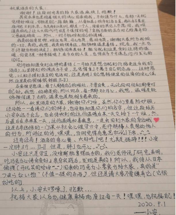 “恭喜您解除隔离,您辛苦了!”“哪里,是麻烦你们了才对!”这样的对话每天都在秋果驿站大堂出现。9月1日,从日本回深圳的交换生小安(化名)离站时,更是再三感谢全体工作人员。原来,22岁日本留学生小安,父母离异,曾患抑郁症,回深的高昂成本花光了她的积蓄。在驿站办理入住时,因寻求父母支付住宿费无果,安某一度精神奔溃。临时党支部当即召开会议,免除安某的伙食费,并减免部分住宿费,缓解其经济压力。同时,每天安排心理医生上门进行心理治疗,减轻其心理焦虑。对于临时党支部提供的帮助,安某十分感激,不仅手写感谢信送给工作专班,还积极发挥其日语优势,为工作人员提供日语翻译。