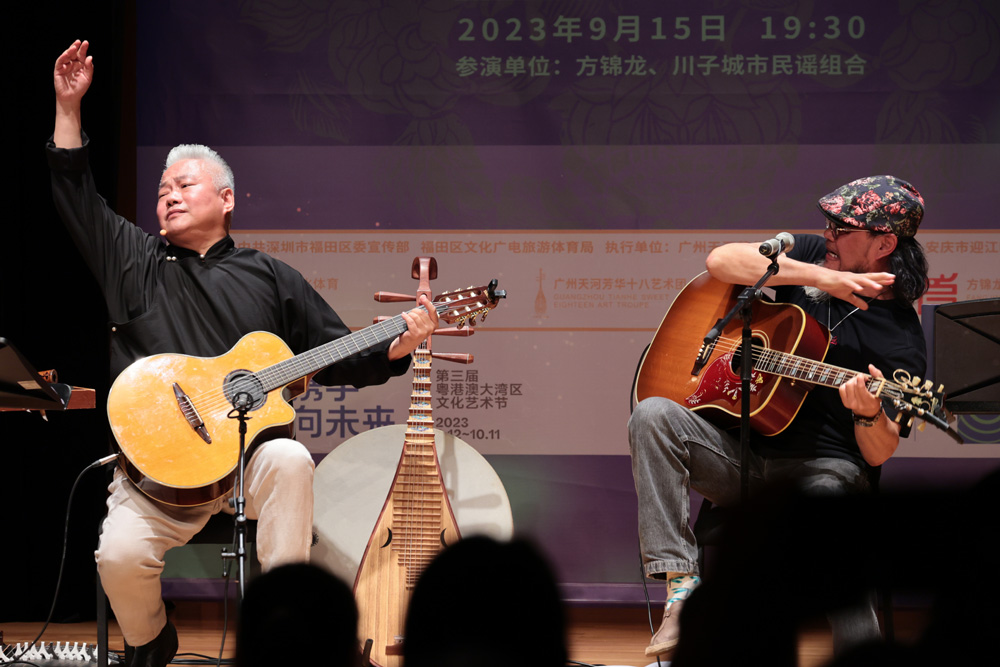 民谣是民族民间音乐的重要构成部分,9月15日首场音乐会《音乐改变人生》——方锦龙&川子城市民谣音乐会,方锦龙请来著名民谣歌手川子和今生缘乐队,以十数首低吟浅唱的温暖歌谣,抚慰忙碌的深圳人。是晚暴雨滂沱,而前来与音乐家们赴约的观众们依然热情不减,歌颂自然抒发胸怀的《前尘大理》《面朝大海》《今生缘》,诠释亲情友情的《童年》《爸爸妈妈》《幸福的紫纱巾》,声声动人,演绎古典名篇的《兰亭序》《陋室铭》《琵琶行》《将进洒》更是触动情怀,让全场欲罢不能。方锦龙在本场音乐会中甘当配角,全程“打酱油”,主唱川子感叹:“能即兴演奏这么多种乐器的只有方锦龙,不可能有第二个人了!”