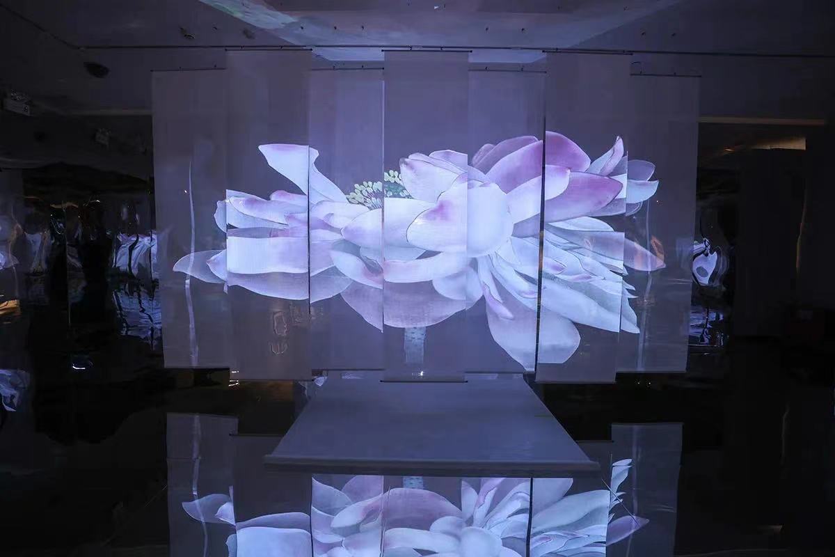 正如我们在《 观 · 荷 》作品所看到的那样,这件作品以陈湘波的工笔“荷花”为基本元素,将中国传统工笔画与现代空间美学相结合,运用现代新媒体交互技术与观众产生互动。在花开花合之中,感悟一花一世界、一念一尘缘的境界。
