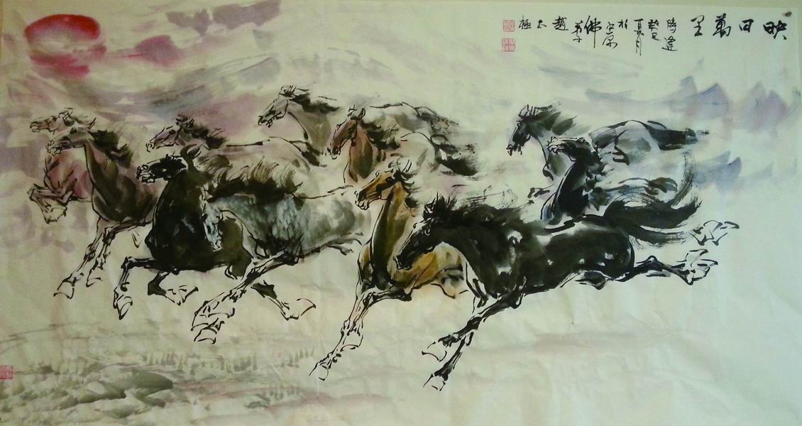 赵太极谈马更是津津乐道,如数家珍。在他看来,马在人类历史上有着不可替代的作用和意义,更有着它独一无二的美。中国人喜欢马,喜欢马的律动,马的力度,马的精神,马的神韵。所有这些,都给画马一个极高的要求,而使许多人欲画马而却步。赵太极正是凭借他高超的造型能力,扎实的绘画功底和对马那种奔腾不息的刚勇精神的追求,毅然踏入了画马的艺术苦旅。他说:“今生与马缘深,这也是缘份吧”。