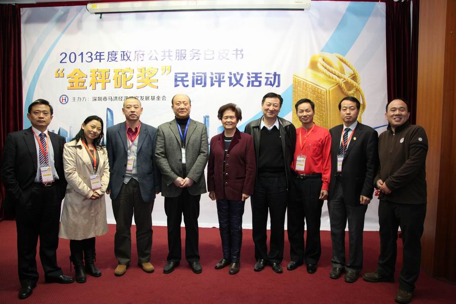 “天地之间有杆秤,那秤砣是老百姓。”2月23日下午,深圳市马洪经济研究发展基金会首开民间机构评议政府部门公共服务的先河,对2013年度43个部门公共服务白皮书任务的完成情况发布评议结果,深圳民间机构首次为政府部门公共服务白皮书落实情况颁出金、银、铜、纸“秤砣奖”。深圳市教育局、福田区政府、市气象局分列前三名获颁“金秤砣奖”,而深圳市应急办、市财委、大鹏新区管委会因调查得分倒数三位获得“纸秤砣奖”。本刊社长李罗力、总编辑孟涣林、执行总编辑贺琼,作为本次现场评分活动的专家,参与了现场评分和总结,为深圳市政府部门的公共服务质量投出了自己宝贵的一票。